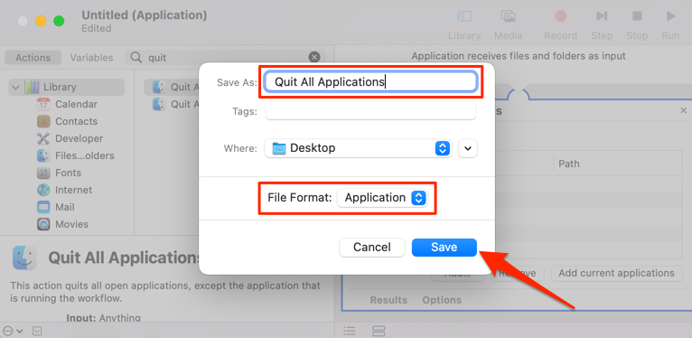 - Press Command + S to save the Automator app shortcut. Make sure you give the app a descriptive name and save it in a location you can easily access or remember. Select Save to proceed.