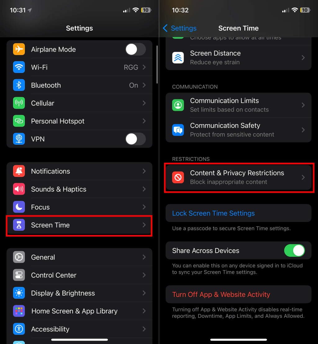 - Go to Settings > Screen Time and tap Content & Privacy Restrictions .