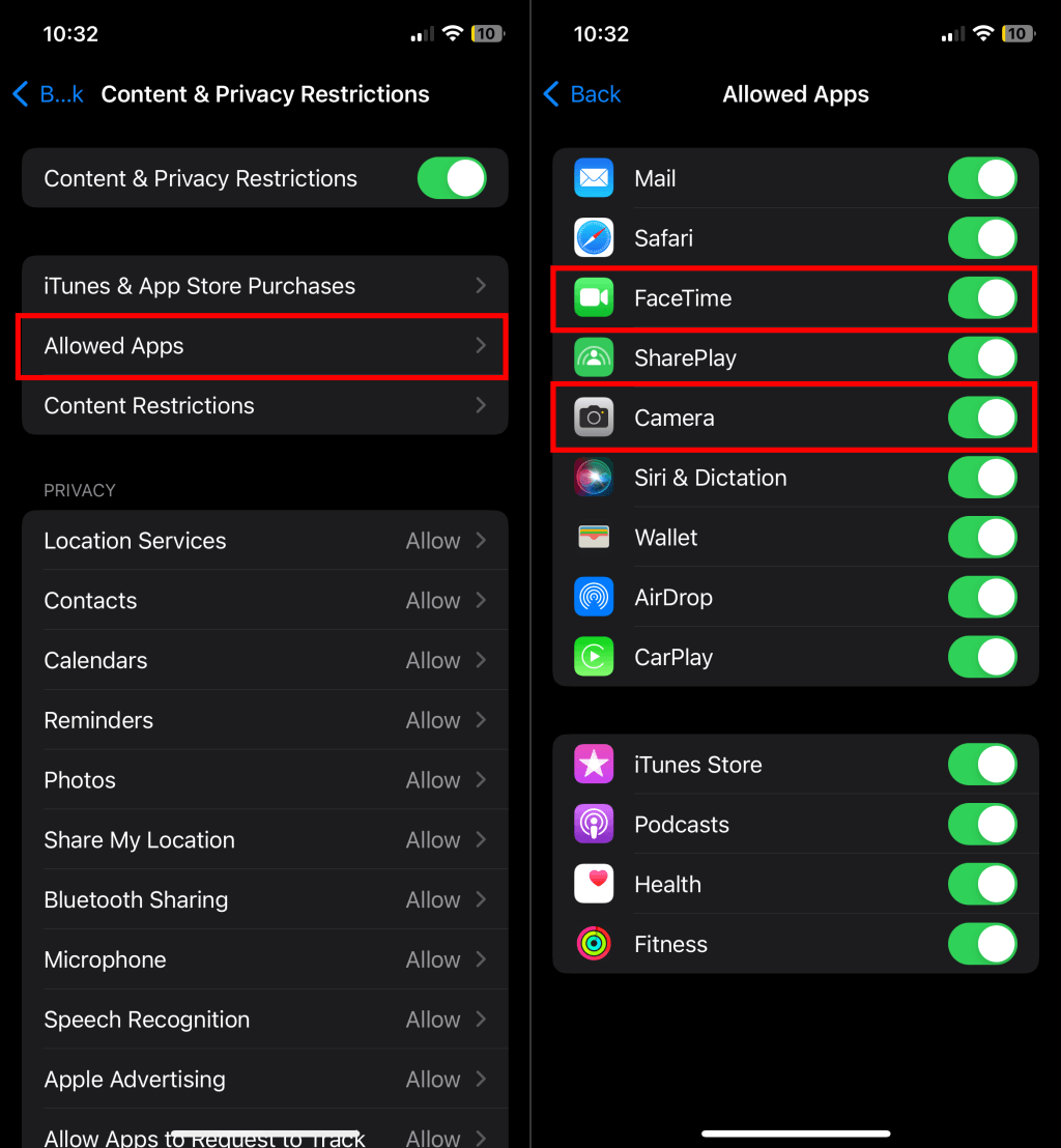 - Select Allowed Apps and turn on Camera and FaceTime .
