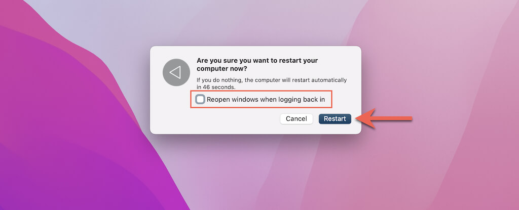 - Uncheck the box next to Reopen windows when logging back in and selecting Restart .
