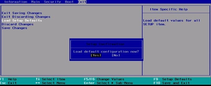 Now go to the Exit menu and select Load Setup Defaults . Finally, choose Exit saving changes .