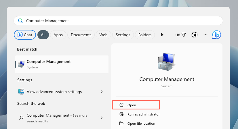- Open the Start menu , type Computer Management into the search box, and select Open .