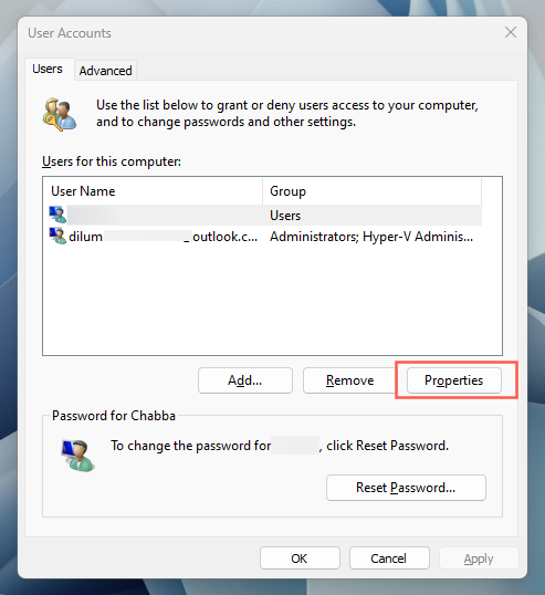 - Under the default Users tab, select the account you want to change and choose Properties .