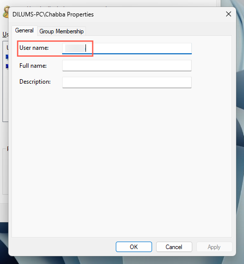 - You can choose to update the user name field and change your nickname. Once completed, confirm the new username in the Full Name field and select Apply > OK .