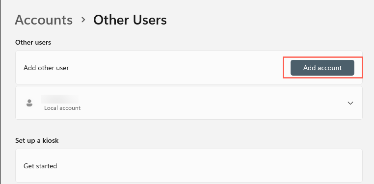 - Select Add account (or Add someone else to this PC in Windows 10).