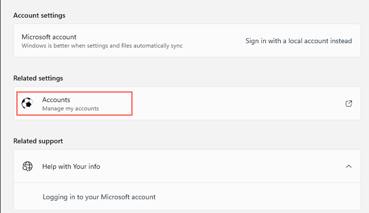 - Select Accounts – Manage my accounts under the Related settings section. )In Windows 10, select Manage my Microsoft account .)