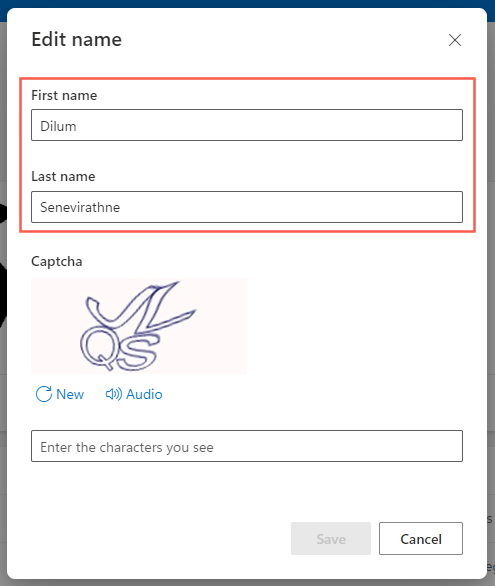 - Enter the new name into the First name and Last name fields, verify that you’re not a robot, and select Save .