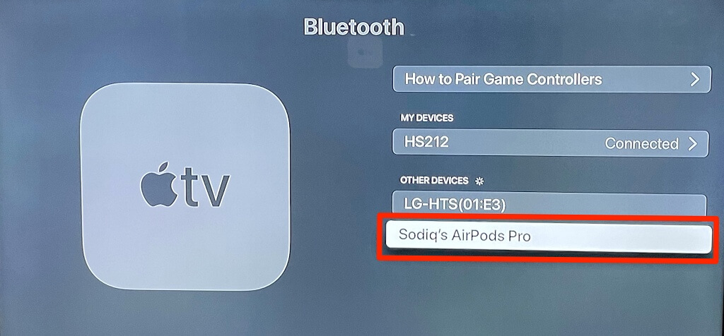 Afterward, head to the Apple TV Bluetooth menu to pair the AirPods.