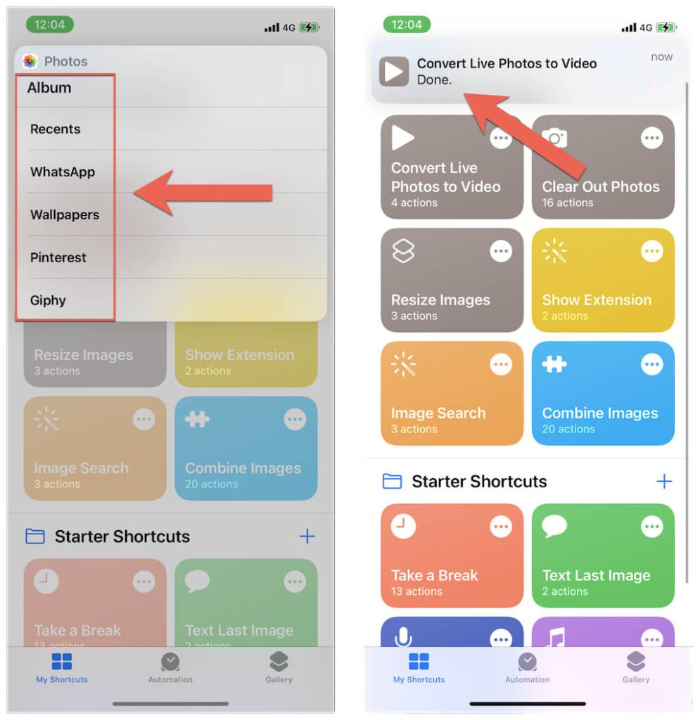 - Pick an album to save the converted videos. You should see a notification once the shortcut finishes performing the conversion from Live Photo to video.
