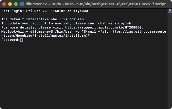 Type in your Mac user password and press Enter again to install HomeBrew. It may take several minutes.