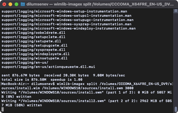 wimlib-imagex split /Volumes/CCCOMA_X64FRE_EN-US_DV9/sources/install.wim /Volumes/WINDOWS10/sources/install.swm 3000