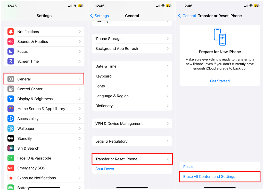 Head to Settings > General > Transfer or Reset iPhone and tap Erase All Content and Settings .