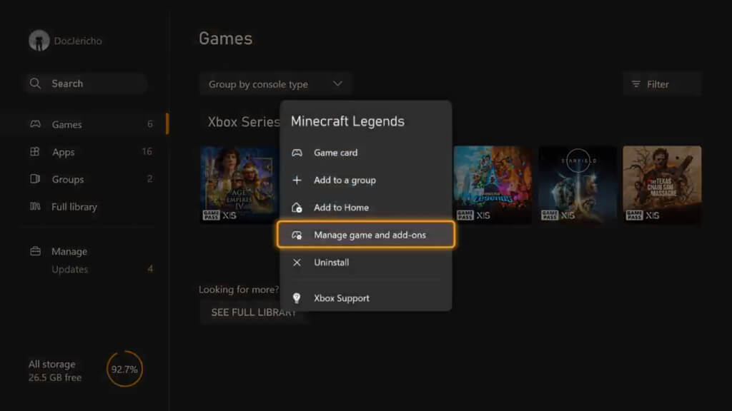 Here, highlight Minecraft Legends, press the Menu Button, and select Manage game and add-ons.