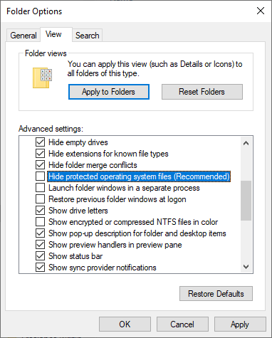 - Select the View tab , then scroll down and uncheck the option that says, “Hide protected operating system files (recommended).” This will uncover the hidden files that contain the recycle bin data.