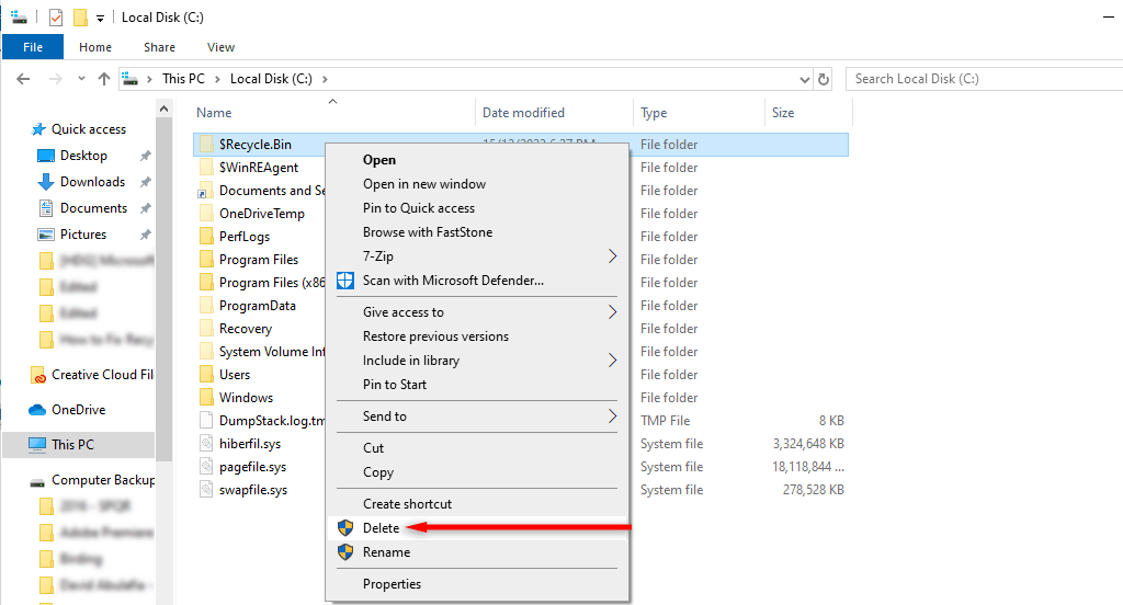- Go back to File Explorer and delete the $ Recycle.Bin folder.