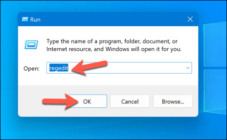 - In Run , type regedit and press OK to launch the Registry Editor.