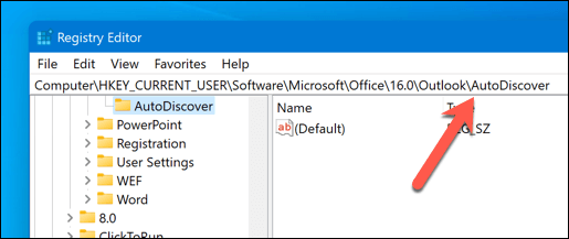 - In the Registry Editor window , use the tree menu on the left or use the navigation bar at the top to locate this key: Computer\HKEY_CURRENT_USER\Software\Microsoft\Office\16.0\Outlook\AutoDiscover . Replace 16.0 with the correct Office version number.