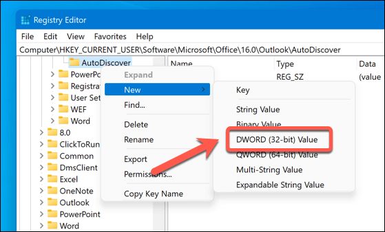 - Right-click on the AutoDiscover key, then choose New > DWORD (32-bit) Value .