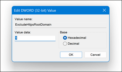 - Name this new value ExcludeHttpsRootDomain and set its Value to 1 .