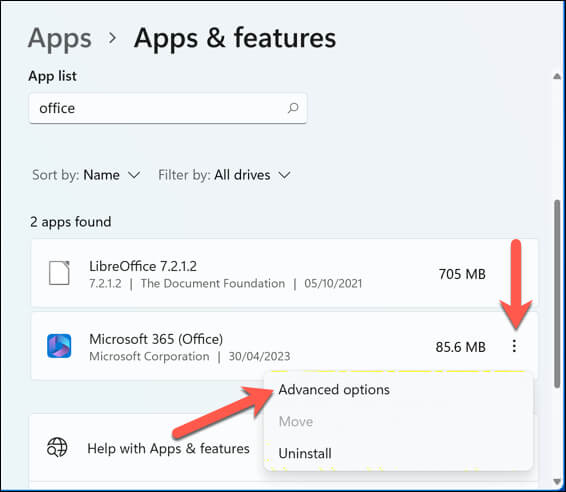 - Select the three-dots icon next to it and select Advanced Options from the drop-down menu.
