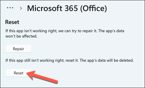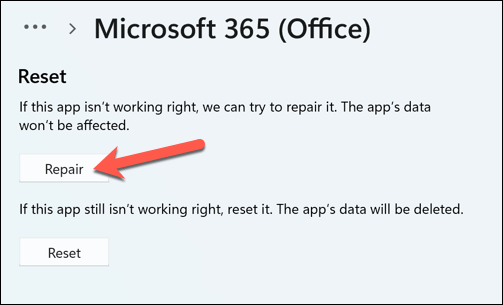 - Follow the on-screen prompts to repair the Office suite, which will also fix any issues with Outlook. If this doesn’t work, choose Reset instead, but you may lose any of your Office configuration settings in the process.
