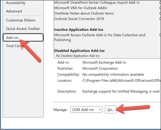 - In the Options menu, press Add-Ins > COM Add-ins and click Go .