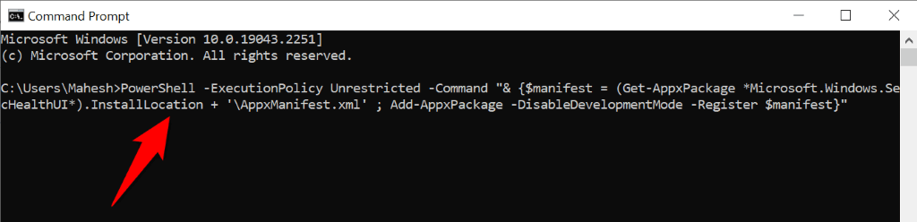 - Type the following in CMD and press Enter : PowerShell -ExecutionPolicy Unrestricted -Command “& {$manifest = (Get-AppxPackage Microsoft.Windows.SecHealthUI).InstallLocation + ‘\AppxManifest.xml’ ; Add-AppxPackage -DisableDevelopmentMode -Register $manifest}”