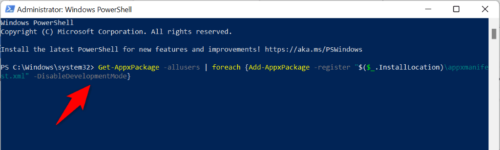 - Enter the following in your PowerShell window and press Enter : Get-AppxPackage -allusers | foreach {Add-AppxPackage -register “$($_.InstallLocation)\appxmanifest.xml” -DisableDevelopmentMode}