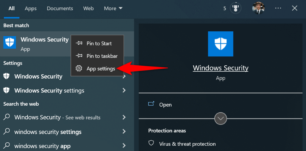 - Open the Start menu, search for Windows Security , right-click the app, and choose App settings .