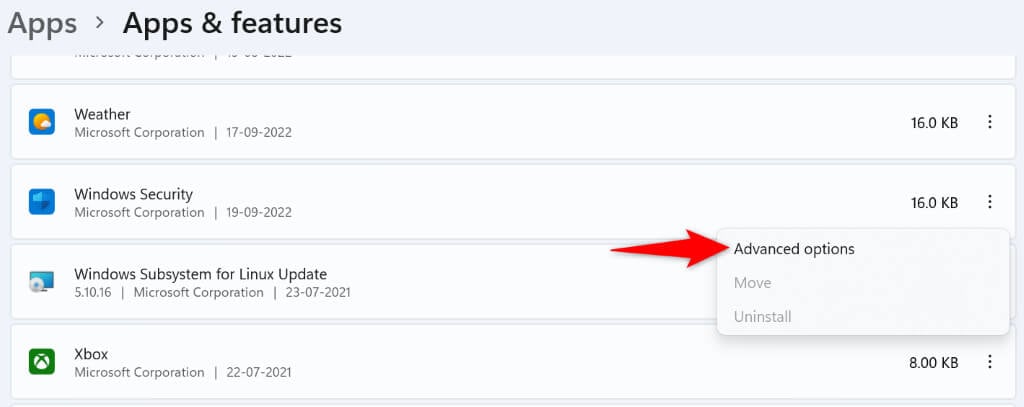 - Locate Windows Security , select the three dots next to the app, and choose Advanced options .