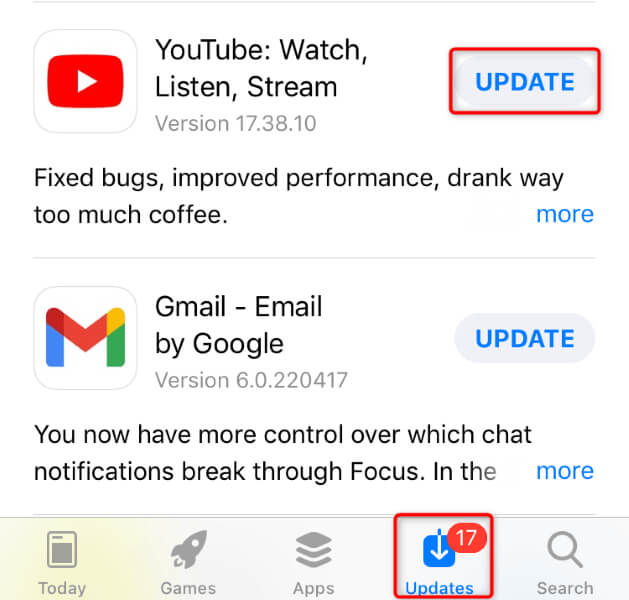 - Choose Update next to YouTube .
