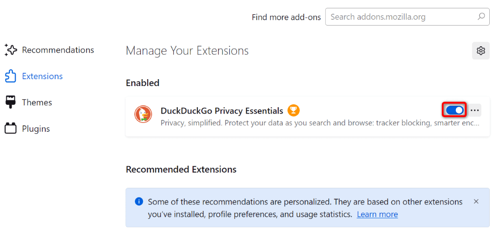 In Mozilla Firefox , select the three horizontal lines in the top-right corner, choose Add-ons and themes , and disable all add-ons.