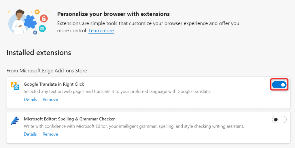 In Microsoft Edge , select the three dots in the top-right corner, choose Extensions > Manage extensions , and deactivate all extensions.