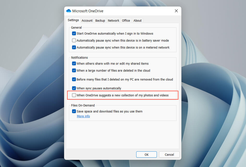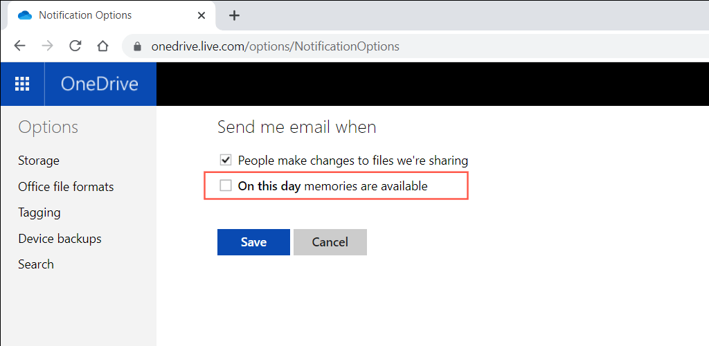 Note : On older versions of OneDrive, you may see an option labeled When “On this day” memories are available instead. Uncheck it to stop “On this day” notifications.