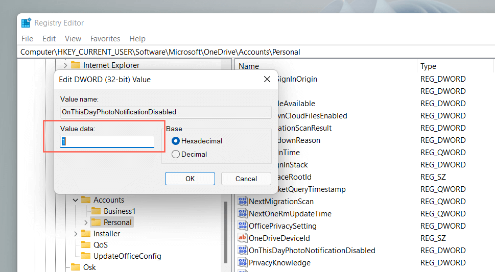 Note : If the registry entry in step 4 appears missing, right-click Personal and select New > DWORD (32-bit) Value . Name it as OnThisDayPhotoNotificationDisabled and save it with a Hexadecimal value of 1 .