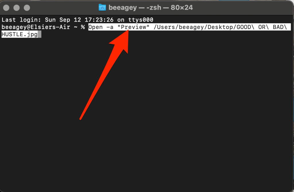 - In the Terminal window, type Open -a “App Name” [file pathway]. For example, you can enter Open -a “Preview” /Users/beeagey/Desktop/GOOD\ OR\ BAD\ HUSTLE.jpg .