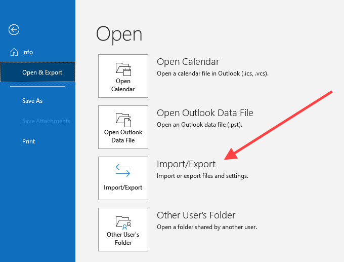 - Open the File menu in Outlook and select Open & Export > Import/Export .