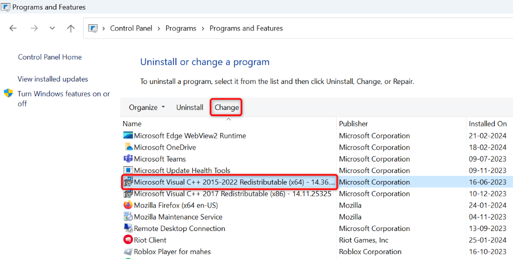 - Select the Microsoft Visual C++ Redistributable package on the list and choose Change at the top.