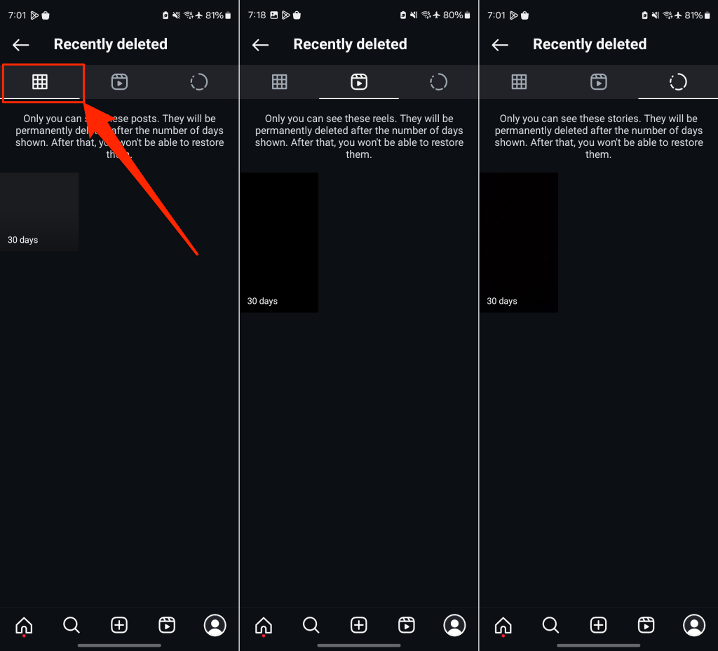 The recently deleted folder/page groups deleted reels, stories, and posts in separate sections. You’ll find regular Instagram posts (photos and videos) in the Posts section—with the Grid icon . You should see how long (in days) you have to restore the post before Instagram deletes it permanently.