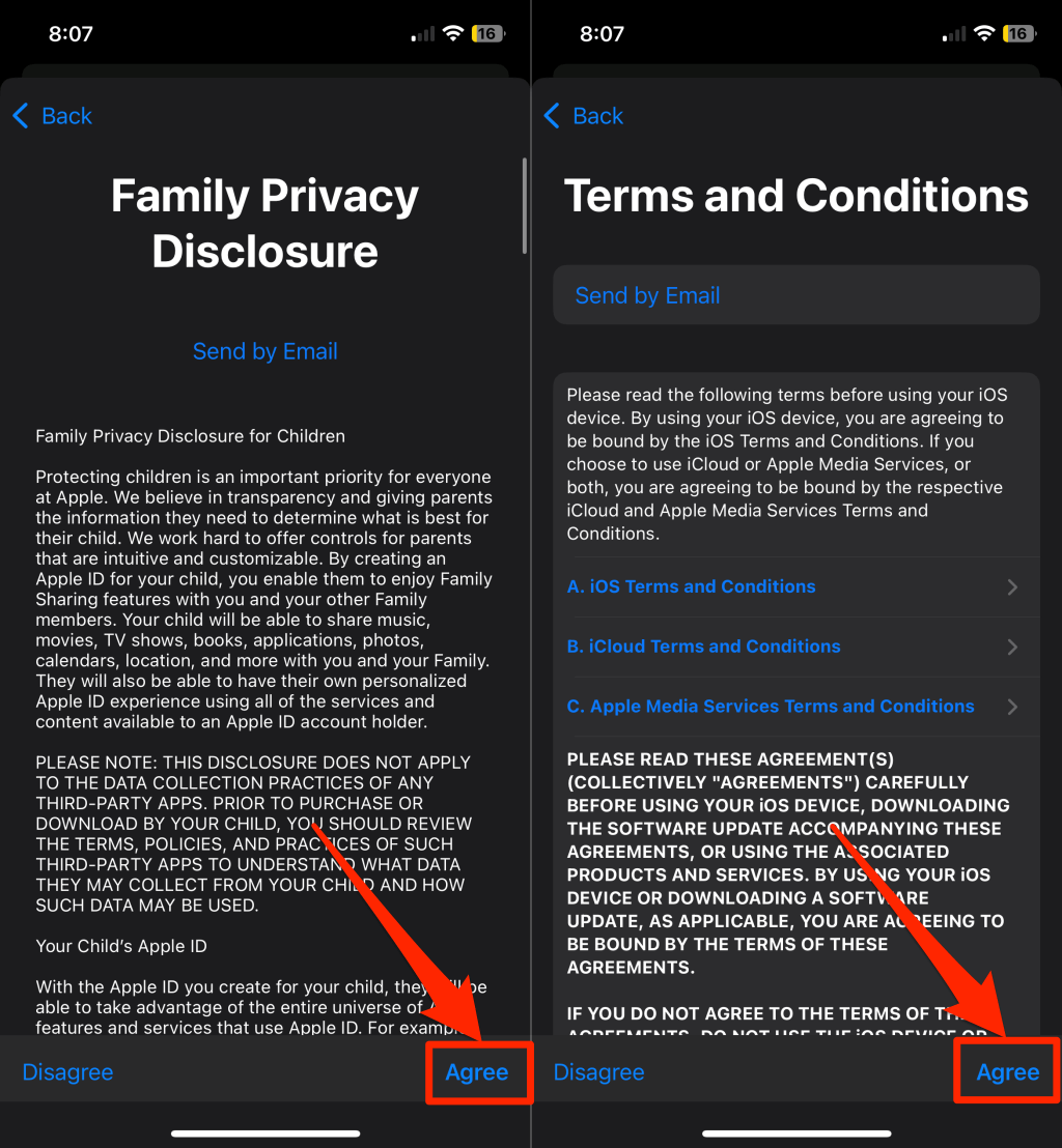 - Read the “Family Privacy Disclosure” and “Terms and Conditions” agreements and tap Agree to continue.