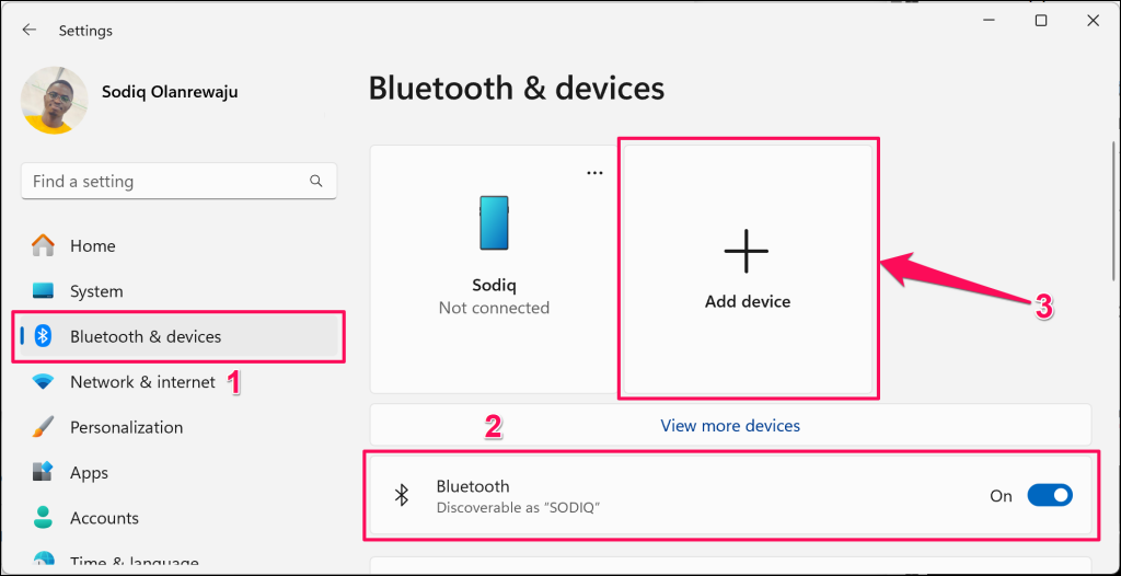 - Select Bluetooth & devices in the sidebar, turn on Bluetooth , and select the Add device button.