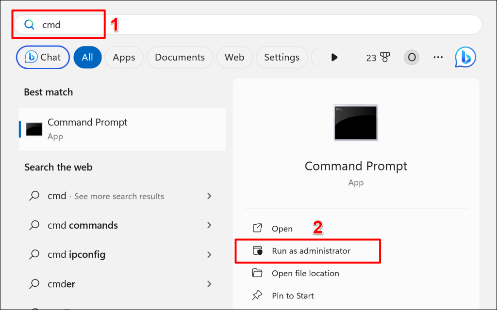 - Open the Start menu, type cmd in the search box, and select Run as administrator .