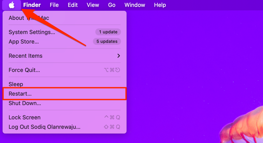 On the Mac, select the Apple logo on the menu bar and choose Restart on the Apple menu.
