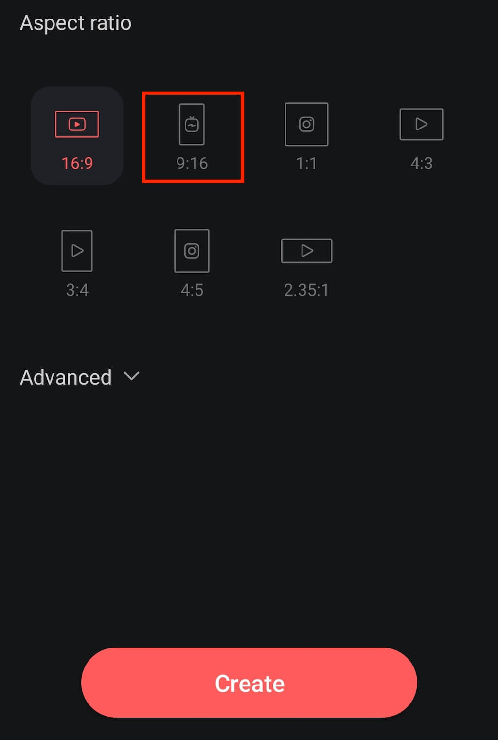 - Choose an Aspect ratio for your video. 9:16 is the perfect option for Boomerang videos on Instagram and other social media platforms like TikTok. Select Create to continue.