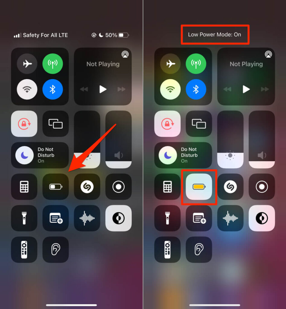 A faster alternative is to open your iPhone’s Control Center and tap the battery icon. The battery icon will change to yellow and a “Low Power Mode: On” alert will appear on the Control Center.