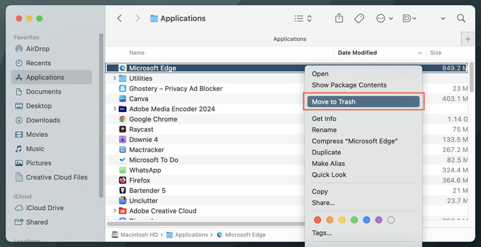 - Locate Microsoft Edge in your Applications folder and drag it to the Trash. Or, Control -click and select Move to Trash .