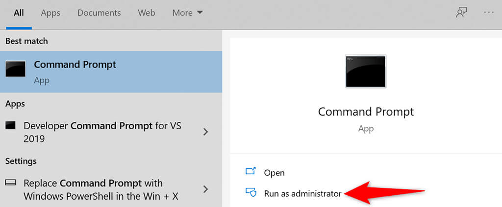 - Search “command prompt” in the Start menu and select Run as administrator .