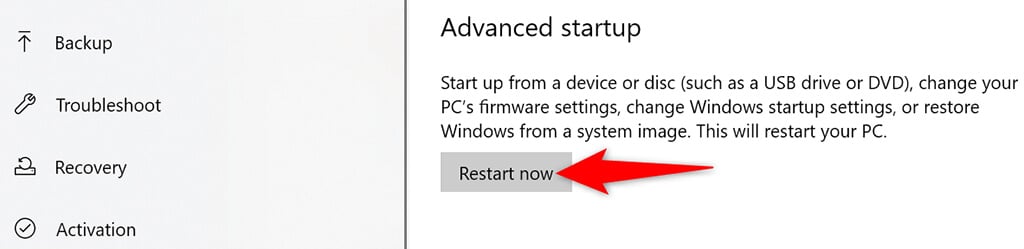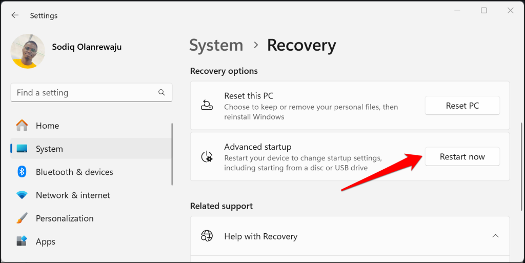 - Select System on the sidebar, choose Recovery , and select the Restart now button in the “Advanced startup” row.