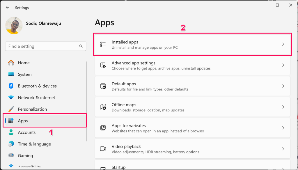 - Choose Apps in the sidebar and select Installed apps .