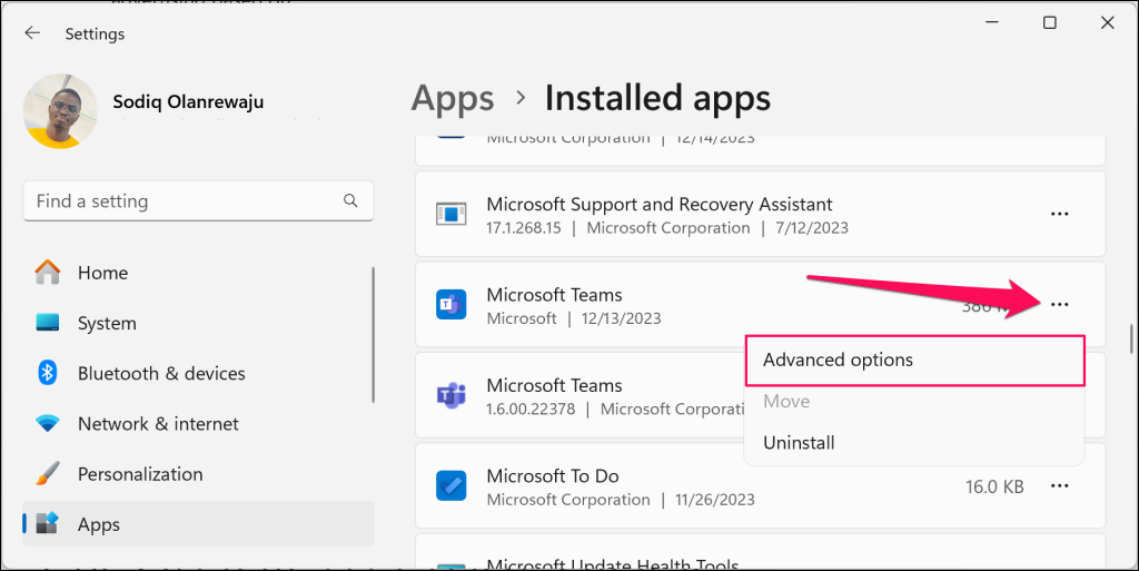 Go to Settings > Apps > Installed apps , select the three-dot menu icon next to the app, and select Advanced options.